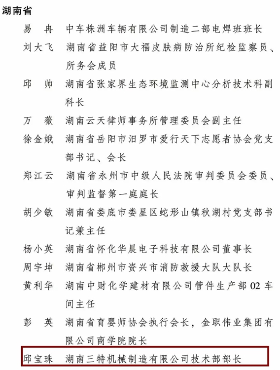 為表彰先進、樹立榜樣,進一步引領和激勵廣大婦女堅定不移聽黨話、跟黨奮進新征程,豪情滿懷、意氣風發(fā)投入推進中國式現代化的偉大實踐,日前,全國婦聯決定授予10人全國三八紅旗手標兵稱號,298人全國三八紅旗手稱號,授予199個單位全國三八紅旗集體稱號,其中,來自桃源的湖南三特機械制造有限公司技術部部長 邱寶珠 獲得全國三八紅旗手榮譽。
