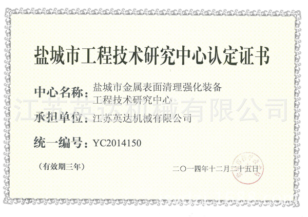 公司率先通過ISO9001:2008質量管理體系認證、ISO14001:2004環境管理體系認證。擁有一支專業的技術團隊,先后取得了網帶通過式拋丸機、新型機械回收噴砂房、輥道通過式重鋼拋丸機等三十項產品專利。(注:各項產品專利及所有證書詳見企業官網:http://www.www.sxkangcheng.cn/或阿里誠信檔案)