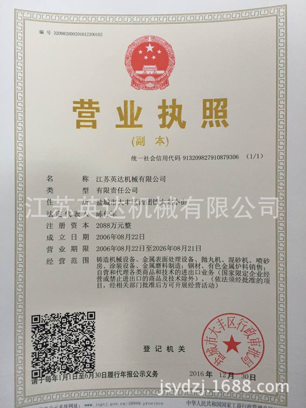 江蘇英達機械有限公司(原大豐市鑄造機械總廠)創建于1976年,是集研發、設計、制造、銷售及安裝服務于一體的高新技術企業。江蘇英達從事表面處理設備的研發和生產40年,獲得二十多項產品專利,主要生產金屬表面清理機械設備、砂處理造型成套設備等機械行業的七大系列產品。產品廣泛應用于鐵路、汽車、船舶、工程機械、冶金、軍工、醫藥等領域。